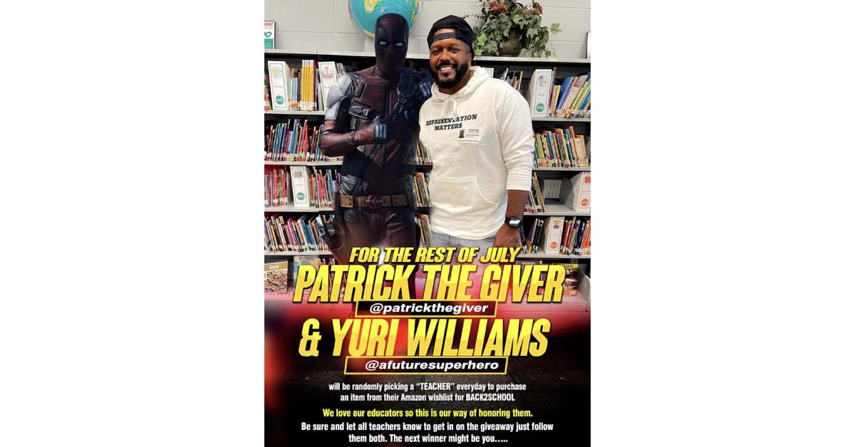 UNITED STATES, July 17, 2023/EINPresswire.com/ — The founder of AFutureSuperHero and Friends-Yuri Williams, and philanthropist Patrick The Giver are combining their efforts throughout July and August to launch a global initiative aimed at helping teachers in need. In an inspiring partnership, both men will select one teacher daily on Twitter app, simply for following their respective Twitter giving accounts – @afuturesuprhero and @patrickthegiver.
