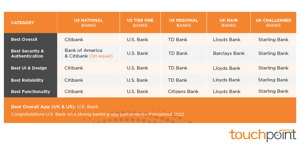 NEW YORK, NEW YORK, UNITED STATES, February 27, 2023 /EINPresswire.com/ — Customer intelligence company Touchpoint Group has announced the winners of its inaugural Banking App Awards for 2022. U.S. Bank won the supreme award for Best Overall Banking App (UK and US), along with Best Overall Banking App in the US Tier One category, and an impressive clean sweep across the four subcategory awards (Best Security & Authentication, Best UI & Design, Best Reliability, and Best Functionality).