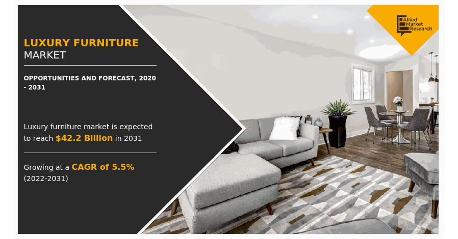 According to a new report published by Allied Market Research, titled, “Luxury Furniture Market,” The luxury furniture market size was valued at $23,771.90 million in 2020, and is estimated to reach $42,159.40 million by 2031, growing at a CAGR of 5.5% from 2022 to 2031. Growth in online mode of sale, rapid urbanization, and change in lifestyle, owing to increased disposable income of the consumers drive the luxury furniture market growth. In addition, development in Asia-Pacific and LAMEA is anticipated to create lucrative global luxury furniture market opportunities.