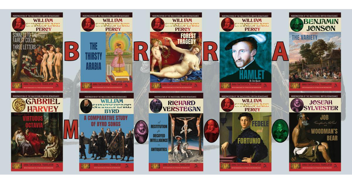 QUANAH, TX, UNITED STATES, February 27, 2023 /EINPresswire.com/ — A new computational-linguistic author-attribution method was applied to 303 different Renaissance texts, and all of them fell into only 6 linguistic groups. The data is publicly-accessible here: https://github.com/faktorovich/Attribution Comparing biographies to the publication dates indicated that these ghostwriters were: Ben Jonson, William Percy, Richard Verstegan, Gabriel Harvey, Josuah Sylvester and William Byrd. The now available for sale 20 volumes of the newly-published “British Renaissance Re-Attribution and Modernization” series (BRRAM): https://anaphoraliterary.com/attribution present overwhelming proof for these re-assignments. Volumes 1-2 present the linguistic, structural, and other technical evidence. Parts I-III translate into Modern English for the first-time great texts that have been inaccessible until now, and thus have prevented scholars from seeing similarities in style between texts such as those with the “Shakespeare”-byline and Percy’s. Part I’s Volumes 3-8 present self-attributed comedies, tragedies and sonnets of Percy. Part II’s Volumes 9-17 solve “Attribution Mysteries”, such as re-attributing and translating for the first time the first quarto of “Hamlet” (the second quarto and first folio editions are those commonly read in school). Part II also provides evidence to re-attribute the “William Cavendish”-bylined “Variety” comedy to Jonson, the “Samuel Brandon”-bylined “Virtuous Octavia” tragicomedy to Harvey, and variedly-bylined (including pieces from “Shakespeare”, “Raleigh” and “Dyer”) verse in an anthology to Byrd. And Part III’s Volumes 18-20 present self-attributed books from the ghostwriters: Verstegan’s first Old English dictionary and Anglo-Saxon mythology-foundation, “A Restitution for Decayed Intelligence in Antiquities” (1605), Gabriel Harvey’s Latin (and now translated into English for the first time) satire about pseudonyms, “Smith: Or, The Tears of the Muses” (1578) and Sylvester’s first and only verse English translation of the “Book of Job” and the absurd fantasy “Woodman’s Bear” (1620).
