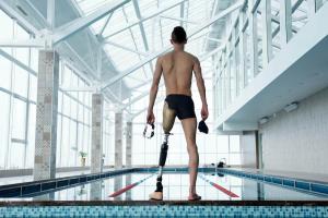 A disabled swimmer gets ready to diver into an empty swimming pool
