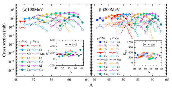 The calculated isotopic cross section for fragments by TALYS-1.96 in the γ+63Cu and p+62Ni reactions at Eγ = 100MeV [in (a)] and 200 MeV [in (b)], respectively.