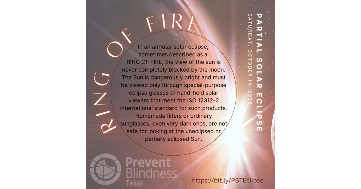 Prevent Blindness Texas, state’s leading vision nonprofit, is urging public to prepare and protect eyes for upcoming annular solar eclipse on Oct. 14, 2023.