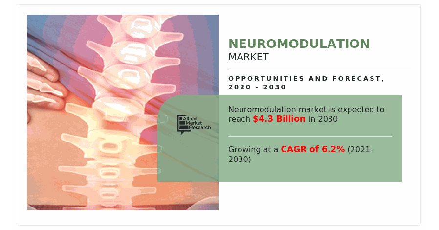 PORTLAND, OREGON, UNITED STATES, October 19, 2023 /EINPresswire.com/ — The Neuromodulation Market stands at the forefront of healthcare innovation, revolutionizing the management of chronic pain and neurological disorders. With a surge in demand for non-pharmacological alternatives, neuromodulation techniques, such as spinal cord and deep brain stimulation, are offering renewed hope to patients seeking relief from debilitating conditions. This market’s remarkable growth is driven by the pursuit of enhanced quality of life, personalized treatments, and the advancement of implantable devices. According to the report published by Allied Market Research, the global Neuromodulation Market was estimated at $2.48 billion in 2020, and is anticipated to hit $4.34 billion by 2030, registering a CAGR of 6.2% from 2020 to 2030.