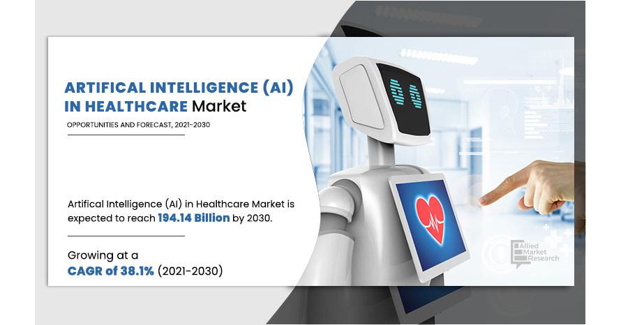 PORTLAND, OREGON, UNITED STATES, February 22, 2023 /EINPresswire.com/ — AI in healthcare market was valued at $8.23 billion in 2020, and is estimated to reach $194.14 billion by 2030, growing at a CAGR of 38.1% from 2021 to 2030. Artificial intelligence assists machines to perform any task without human interventions. It uses different algorithms and software that help the machine to inculcate perception and reasoning for various situations. AI is widely applicable in the healthcare sector for various purposes such as drug discovery and precision medicine. In addition, it is used to analyze a patient’s medical data, predict disease onset, and personalize treatment provided to the patient.