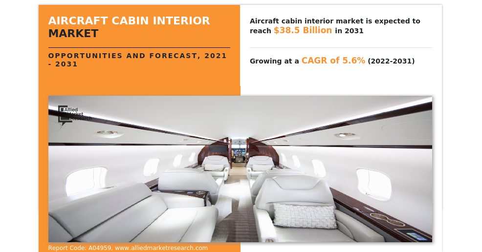 PORTLAND, OREGON, UNITED STATES, October 25, 2023 /EINPresswire.com/ — by Allied Market Research, the global aircraft cabin interior market garnered $22.8 billion in 2021, and is estimated to generate $38.5 billion by 2031, manifesting a CAGR of 5.6% from 2022 to 2031. The report provides an extensive analysis of changing market dynamics, major segments, value chain, competitive scenario, and regional landscape. This research offers a valuable guidance to leading players, investors, shareholders, and startups in devising strategies for the sustainable growth and gaining competitive edge in the market.