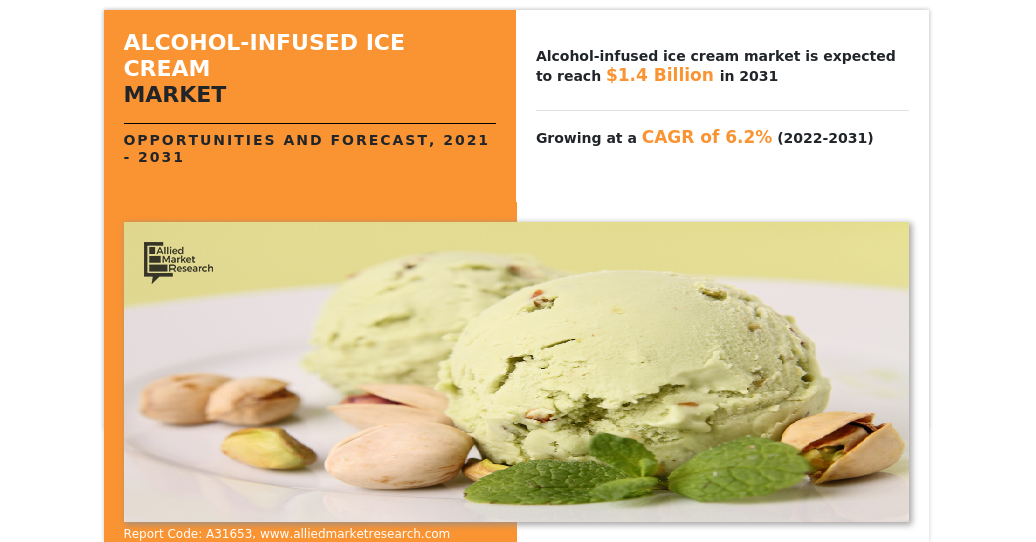 PORTLAND, OR, UNITED STATES, July 24, 2023/EINPresswire.com/ — According to a new report published by Allied Market Research, titled, “Alcohol-Infused Ice Cream Market,” The alcohol-infused ice cream market was valued at $786.67 million in 2021, and is estimated to reach $1.4 billion by 2031, growing at a CAGR of 6.2% from 2022 to 2031.