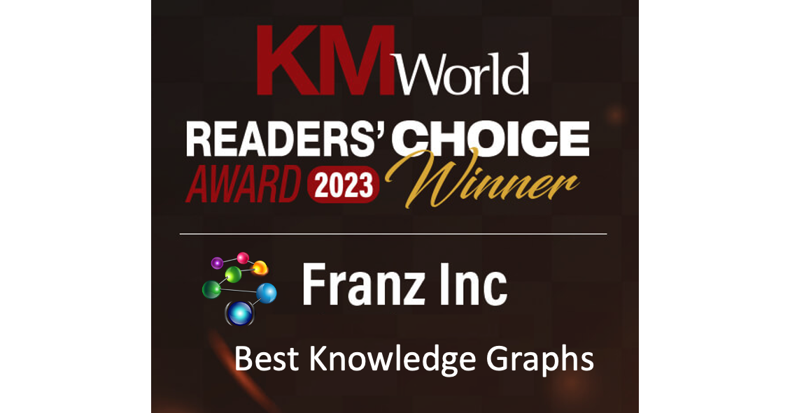 LAFAYETTE, CALIFORNIA, USA, November 8, 2023 /EINPresswire.com/ — Franz Inc., an early innovator in Artificial Intelligence (AI) and leading supplier of Graph Database technology for Entity-Event Knowledge Graph Solutions, today announced it has been named the “Best Knowledge Graph” in the 2023 KMWorld Readers’ Choice Award voting.