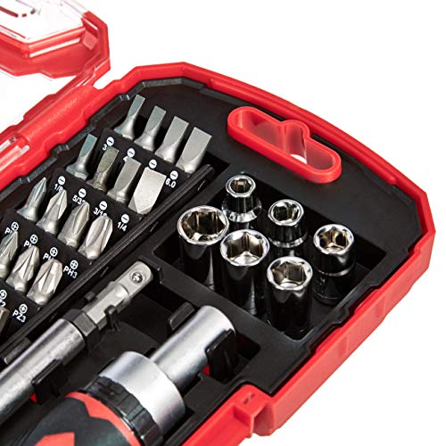 Plastic carrying case included with dedicated storage space for the screwdriver, sockets, and bits