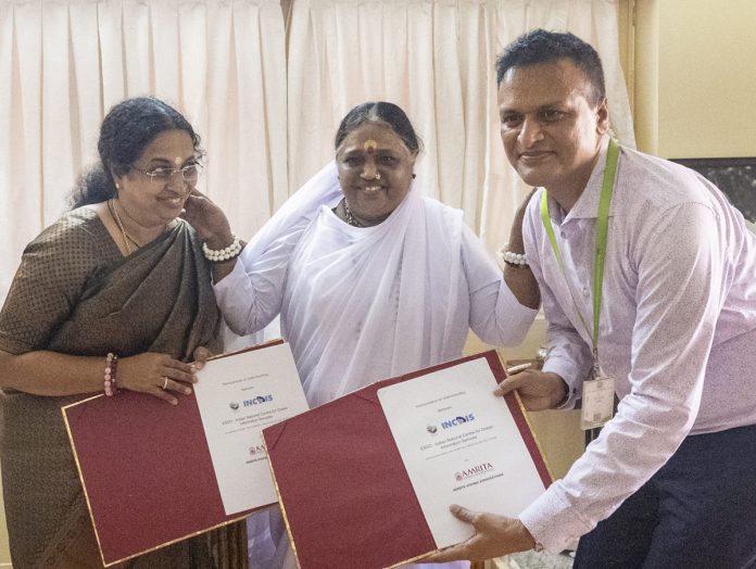 The MoU is on behalf of the Amrita School for Sustainable Development, UNESCO Chair on Experiential Learning for Sustainable Innovation & Development, and Amrita Centre for Wireless Networks & Applications. It was jointly signed by Dr. Srinivasa Kumar, Director, INCOIS, and Dr. Maneesha Vinodini Ramesh, Provost, Amrita Vishwa Vidyapeetham and took place in the presence of Sri Mata Amritanandamayi Devi, Chancellor, Amrita Vishwa Vidyapeetham.