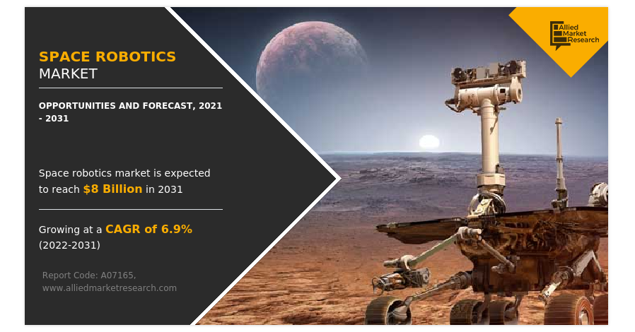 OREGAON, PORTLAND, UNITED STATES, April 17, 2023 /EINPresswire.com/ — Allied Market Research published a report, titled, “Space Robotics Market by Solution (Remotely Operated Vehicles, Remote Manipulator System, Software, Services), by Application (Deep Space, Near Space, Ground), by End User (Commercial, Government): Global Opportunity Analysis and Industry Forecast, 2021-2031” According to the report, the space robotics industry generated $4.3 billion in 2021 and is estimated to reach $8 billion by 2031, witnessing a CAGR of 6.9% from 2022 to 2031.