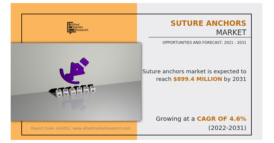 PORTLAND, OREGON, UNITED STATES, October 6, 2023 /EINPresswire.com/ — The Suture Anchors Market is a critical component of modern orthopedic and surgical care. These tiny devices play a vital role in securing soft tissues, ligaments, and tendons to bone during surgical procedures. Whether in orthopedic surgeries, sports medicine, or other medical fields, suture anchors are instrumental in achieving stable and long-lasting repairs. As surgical techniques advance and the demand for minimally invasive procedures grows, the suture anchors market continues to evolve, offering improved solutions for patients and healthcare professionals alike, and contributing to better outcomes in musculoskeletal health. The global suture anchors market size was valued at $572.5 million in 2021, and is projected to reach $899.4 million by 2031, growing at a CAGR of 4.6% from 2022 to 2031.