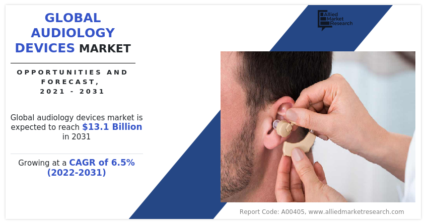 PORTLAND, OREGON, UNITED STATES, April 25, 2023 /EINPresswire.com/ — Allied Market Research has published a study report with the title Audiology Devices Market Size was Valued at 𝐔𝐒𝐃 𝟕.𝟐 𝐛𝐢𝐥𝐥𝐢𝐨𝐧 𝐢𝐧 𝟐𝟎𝟐𝟏 and is Anticipated to Garner 𝐔𝐒𝐃 𝟏𝟑.𝟏 𝐛𝐢𝐥𝐥𝐢𝐨𝐧 𝐛𝐲 𝟐𝟎𝟑𝟏, registering a 𝐂𝐀𝐆𝐑 𝐨𝐟 𝟔.𝟓% from 2022 to 2031.