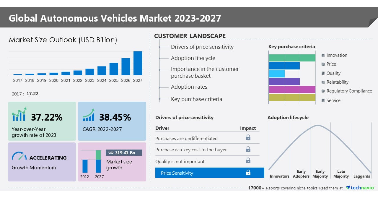 NEW YORK, Feb. 28, 2023 /PRNewswire/ — The global autonomous vehicles market will witness an incremental growth of USD 319.41 billion between 2022 and 2027, accelerating at a CAGR of 38.45% during the forecast period. COVID-19 had the most negative impact on the global automotive industry in recent years, resulting in a steep fall in demand and a large-scale disruption of the supply chain. It has exerted intense pressure on an already-stressed global automotive market. Yet, there are high predictions that few countries are bringing manufacturing facilities and production back on track, indicating that the supply side is on a restoration line. For more insights on the historic (2017 to 2021) and forecast market size (2023 to 2027) – Request a PDF Report Sample
