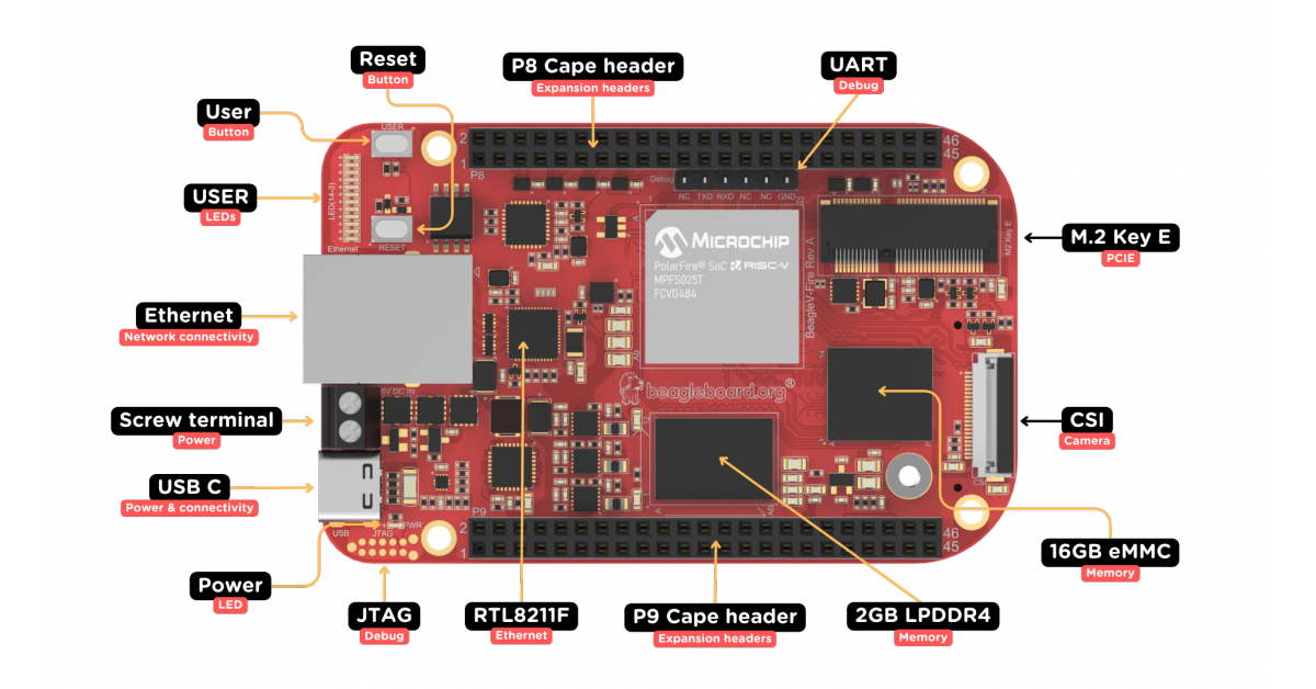 * Open-Source Design: BeagleV®-Fire follows the principles of open-source hardware, allowing users to access and modify the board’s design and firmware, promoting collaboration and innovation within the RISC-V community.