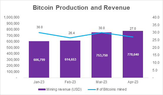 The Company mined 27.0 Bitcoins and achieved a revenue of US$778,640 in April 2023.