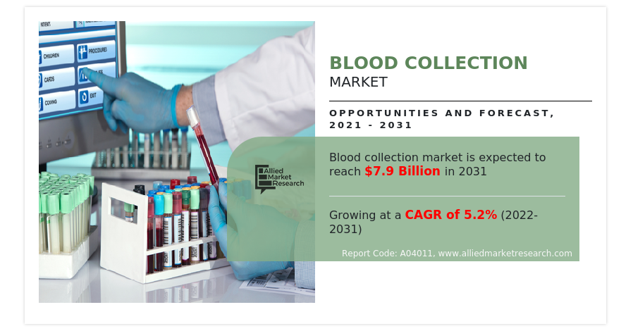 PORTLAND, OREGON, UNITED STATES, April 25, 2023 /EINPresswire.com/ — Allied Market Research has published a study report with the title Blood Collection Market Size was Valued at 𝐔𝐒𝐃 𝟒.𝟖 𝐛𝐢𝐥𝐥𝐢𝐨𝐧 𝐢𝐧 𝟐𝟎𝟐𝟏 and is Projected to Garner 𝐔𝐒𝐃 𝟕.𝟗 𝐛𝐢𝐥𝐥𝐢𝐨𝐧 𝐛𝐲 𝟐𝟎𝟑𝟏, registering a 𝐂𝐀𝐆𝐑 𝐨𝐟 𝟓.𝟐% from 2022 to 2031.