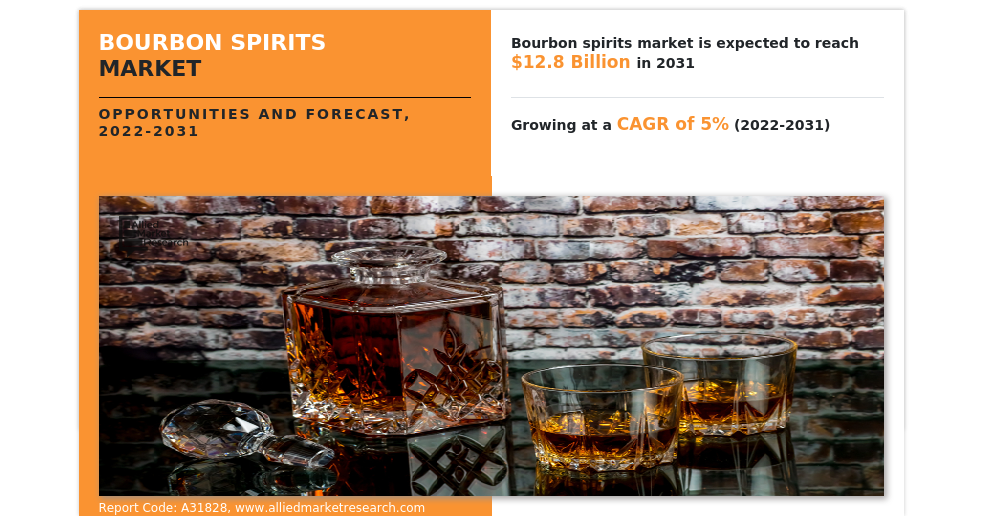 PORTLAND, OR, UNITED STATES, August 7, 2023/EINPresswire.com/ — According to a new report published by Allied Market Research, titled, “Bourbon Spirits Market,” The bourbon spirits market was valued at $7.8 billion in 2021, and is estimated to reach $12.8 billion by 2031, growing at a CAGR of 5% from 2022 to 2031.
