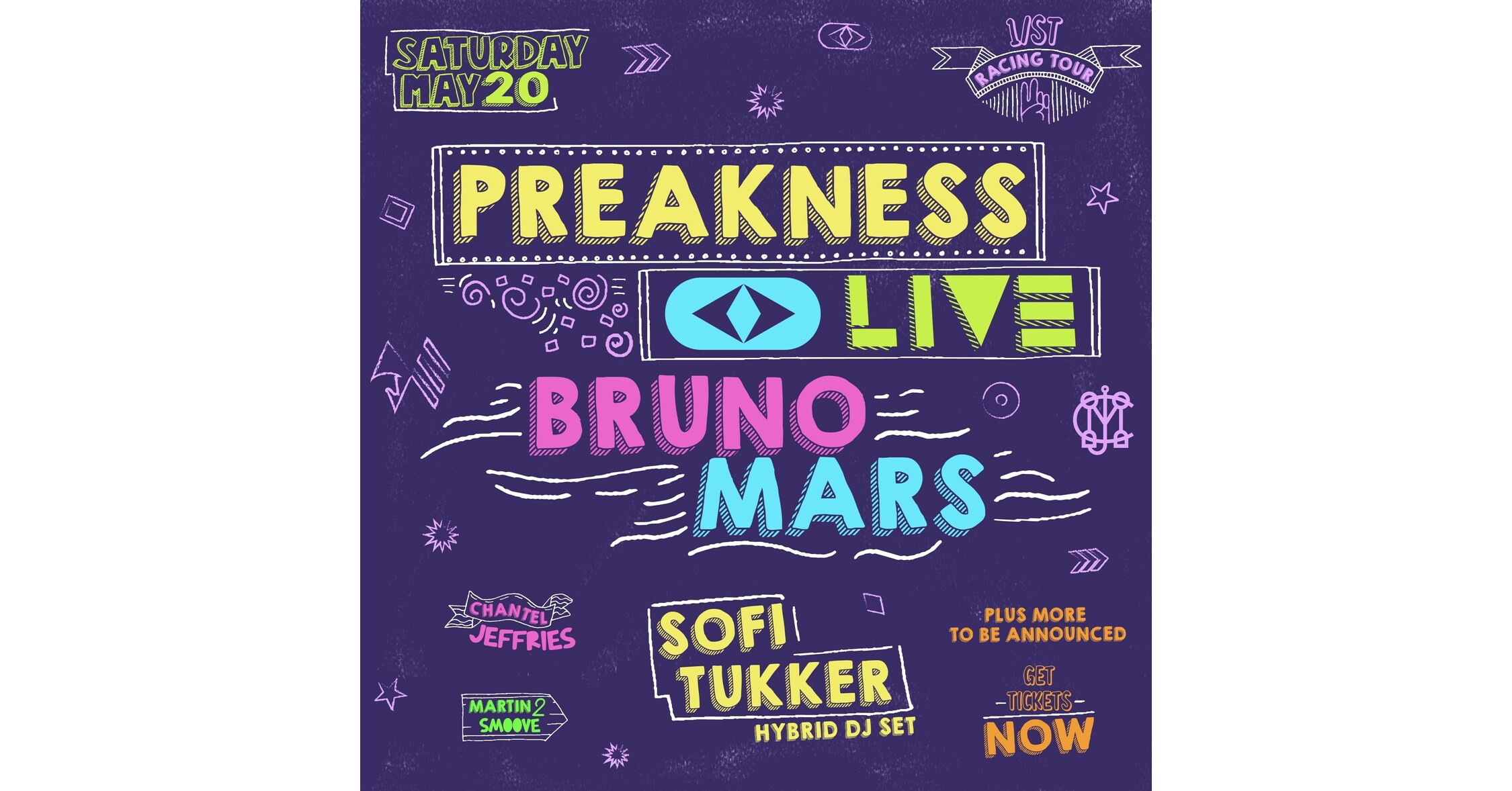 This year Preakness LIVE will take over the Pimlico infield evolving the Infield Fest experience to usher in a new era for live music, entertainment, arts and culture on Preakness day. Celebrated singer, songwriter, producer and musician Bruno Mars – who has sold over 200 million singles worldwide – will return to the legendary Pimlico infield to bring his 24-karat magic back to Baltimore, 11-years after his first performance at the Preakness. Preakness LIVE will feature a full day of live music and entertainment beginning at 10:30 a.m. on Saturday, May 20 with performances by Grammy nominated musical duo SOFI TUKKER, DJ Chantel Jeffries, Martin 2 Smoove and many more.