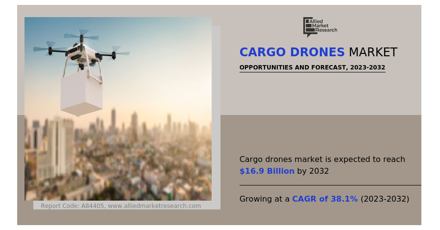 PORTLAND, OREGAON, UNITED STATES, October 9, 2023 /EINPresswire.com/ — Allied Market Research published a report, titled, “Cargo Drones Market by Propulsion (Gasoline-powered, Electric, Hybrid, and Others), Wing Type (Fixed-Wing, Multi-Rotor, and Hybrid), Industry (Retail, Healthcare, Agriculture, Defense, and Others, and Payload (0.5 to100 kg, 101 to 1000 kg, and above 1000 kg): Global Opportunity Analysis and Industry Forecast, 2023-2032”. According to the report, the global cargo drones industry generated $0.68 billion in 2022 and is anticipated to generate $16.9 billion by 2032, witnessing a CAGR of 38.1% from 2023 to 2032.