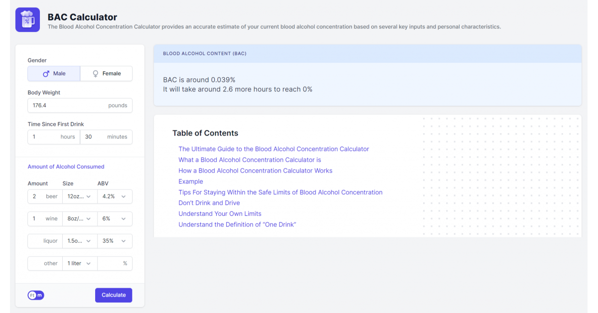Introducing Calculator.io’s BAC Calculator – a tool for calculating Blood Alcohol Concentration. Perfect for drivers, party-goers, and alcohol enthusiasts.