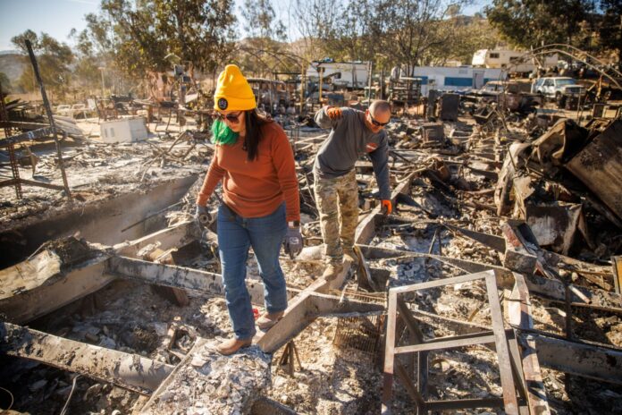 Top photo: Relatives walk through the remains of their family’s home after it was destroyed during the Highland Fire in Aguanga, California, US, on Tuesday, Oct. 31, 2023. A wildfire fueled by gusty Santa Ana winds ripped through rural land southeast of Los Angeles, forcing about 4,000 people from their homes, fire authorities said.