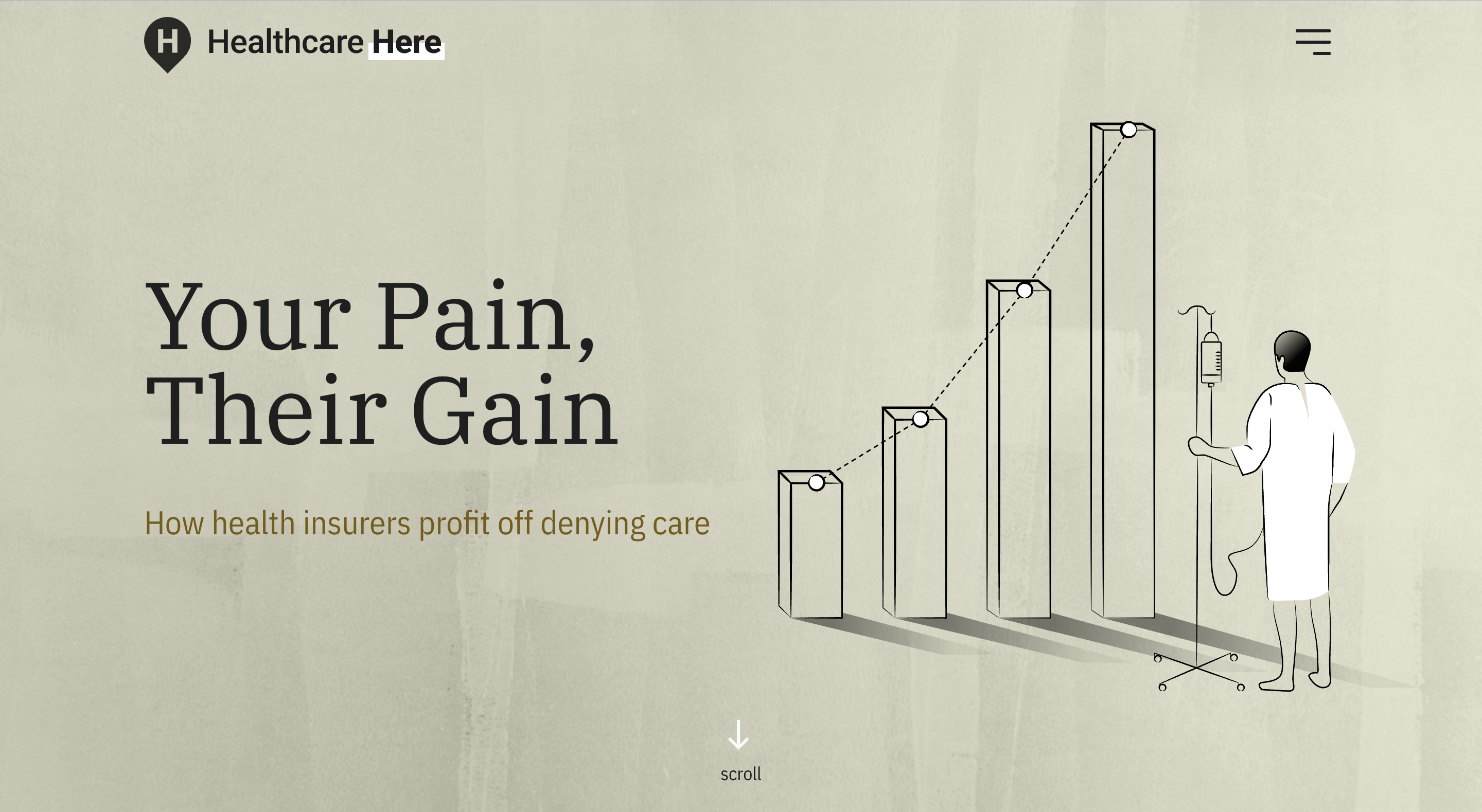 The website also notes that commercial insurers have raised premiums 14.5 percent over the past five years. It ahighlights the practice of using an algorithm to approve or deny a claim, citing for example that Cigna spent an average of 1.2 seconds per case to deny more than 300,000 claims.