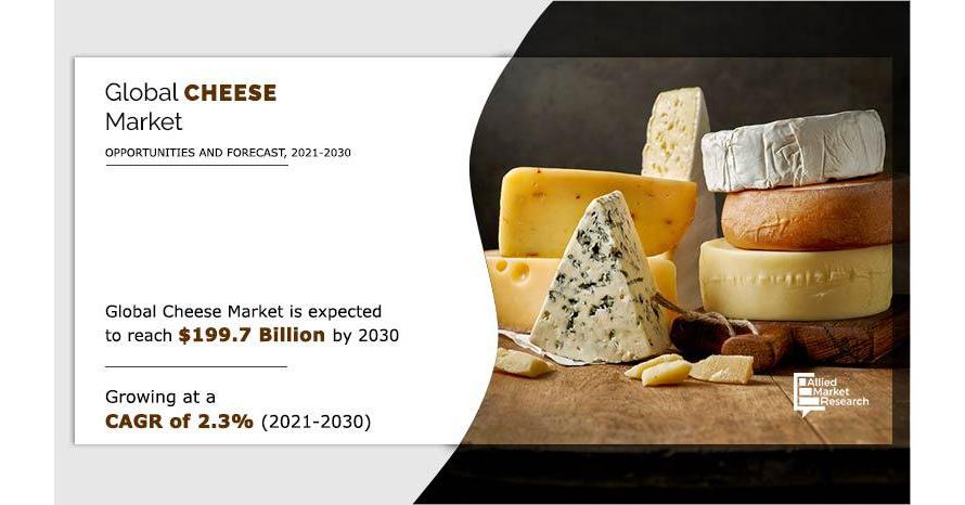 PORTLAND, OR, UNITED STATES, August 10, 2023/EINPresswire.com/ — According to a new report published by Allied Market Research, titled, “Cheese Market by Product Source, Type, Product, and Distribution Channel: Global Opportunity Analysis and Industry Forecast, 2021–2030,” the global cheese market was valued at $156.9 billion in 2020, and is projected to reach $199.7 billion by 2030, growing at a CAGR of 2.3% from 2020 to 2030. The cheddar cheese segment dominated the market in 2020 with more than one-third share, in terms of revenue.