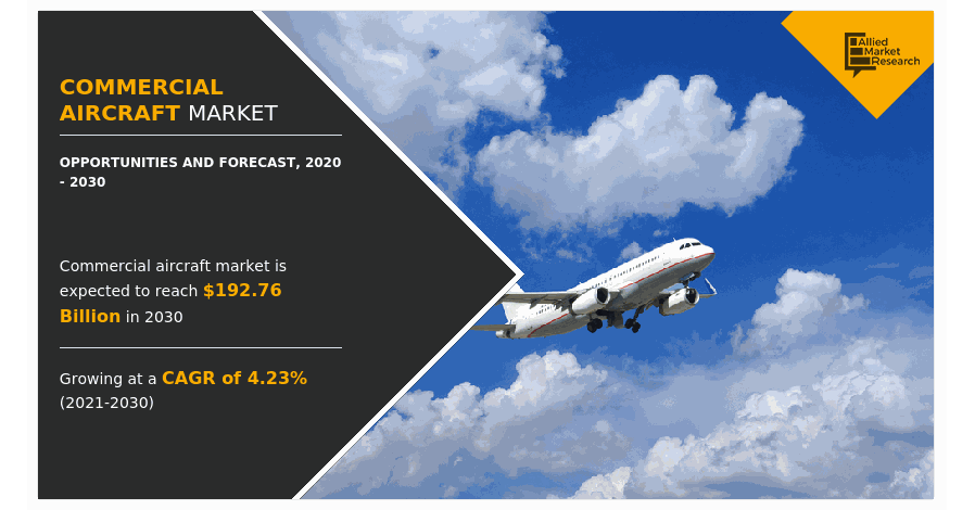 PORTLAND, OREGAON, UNITED STATES, September 25, 2023 /EINPresswire.com/ — Allied Market Research recently published a report, titled, “Commercial Aircraft Market by Size (Narrow Body, Wide Body, Regional & Business Jet, and Freighter), by Application (Passenger, Cargo): Global Opportunity Analysis and Industry Forecast, 2020-2030.” As per the report, the global commercial aircraft market generated $128.21 billion in 2020, and is projected to reach $192.76 billion by 2030, growing at a CAGR of 4.23% from 2021 to 2030.