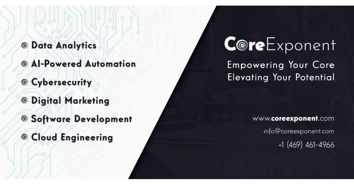 DALLAS, TEXAS, UNITED STATES, October 4, 2023 /EINPresswire.com/ — In today’s fast-paced digital environment, CoreExponent, a top provider of technology solutions, is excited to announce the release of its cutting-edge technological solutions. With a dedication to innovation and excellence, CoreExponent seeks to transform how companies run and prosper in the digital world.