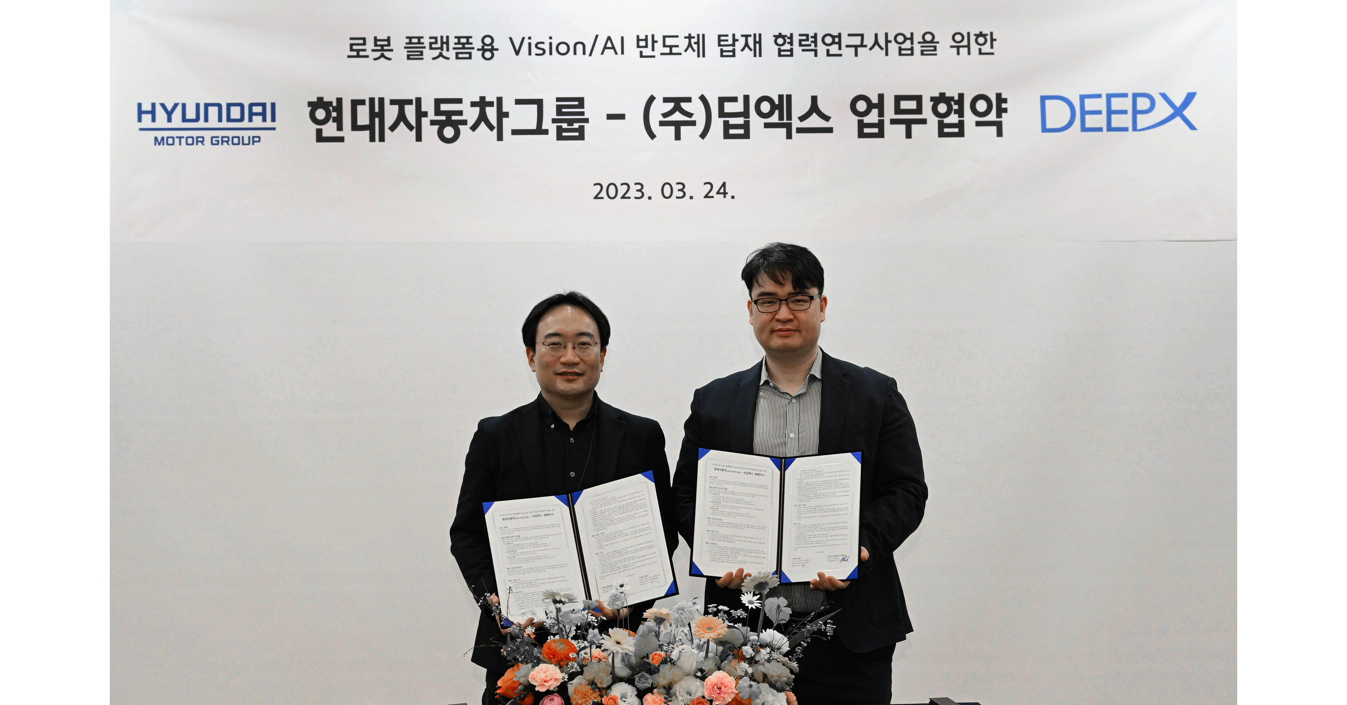 On March 24 (Friday) at the Uiwang Research Facility of Hyundai Motors & Kia Corporation, DEEPX announced its execution of the MOU on AI semiconductor collaboration use for robot platforms, with the representatives of both companies including Lok-Won Kim CEO, and Dong-Jin Hyun, Robotics Lab leader of Hyundai Motors & Kia Corporation.