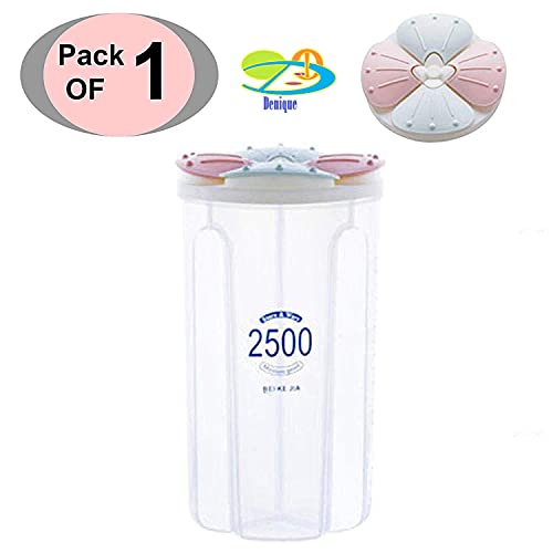 Food stays fresh for long in this food storage jar. The lid has an airtight seal that keeps foods fresh. It has 4 sections, which divide the jar into 4 storage compartments and maximizes its storage capacity. Keep 4 different foods in the same jar. A dispenser hole lets you pour out only the items that you need. It is freezer-safe, microwave oven-safe and dishwasher-safe. 4 secure clip locks close the lid safely on the jar. This food storage jar is made from non-bpa, non-toxic plastic.
