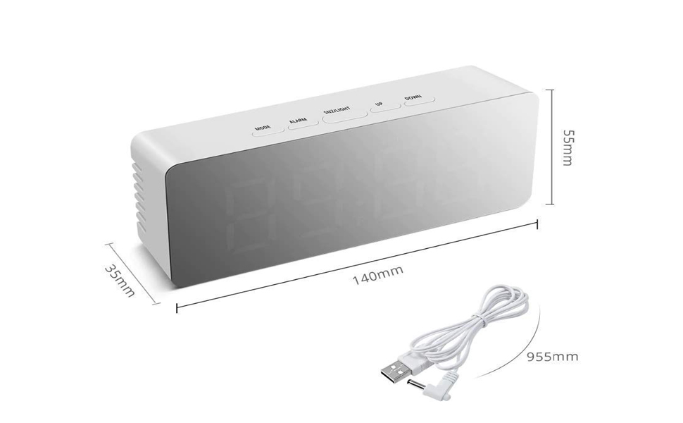 Time, Clock alarm, Temperature display, Night mode, Mirror.