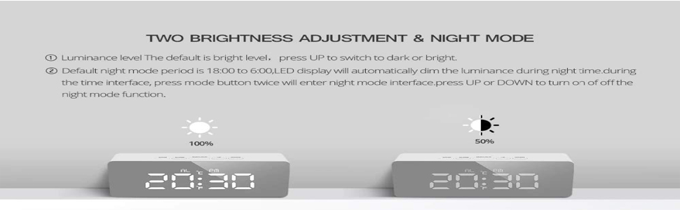 2 Level Display Brightness: The LED alarm clock can be chose 2 level display brightness, follow your heart. Snooze time can be set, unless manually turn off the alarm clock.If only press the “SNA/LIGHT” button, the digital alarm clock will continue to alarm after 5 minutes, must wake you up.