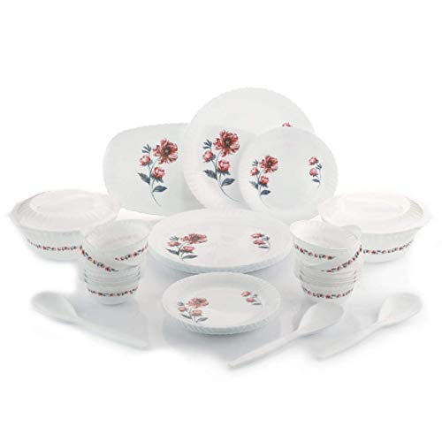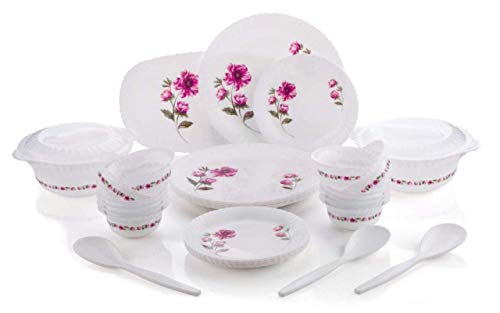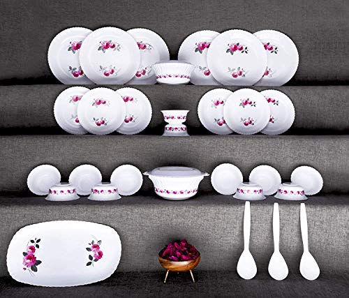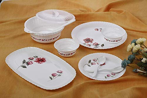 ✦ This dinner set has 6 Full Plates, 6 Quarter Plates, 12 Veg Bowls, 2 Serving Bowl with 2 lids, 3 Serving Spoons and 1 Serving Tray.
