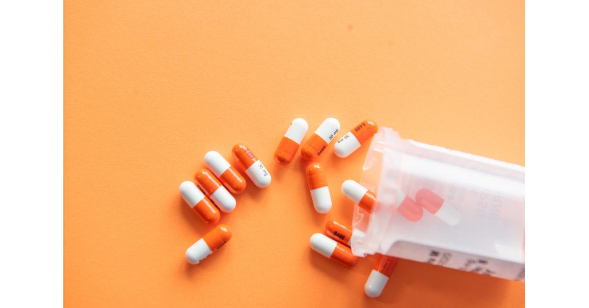 A picture of multiple pills spilled over from an Rx bottle on a table.