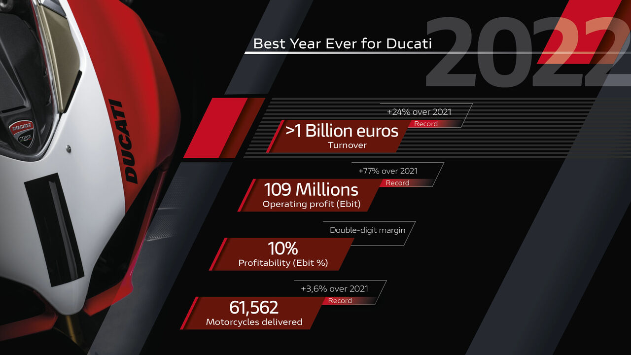 For the first time in its history, Ducati’s revenue overcame 1 billion euros figure (1,089 million euros), marking an increase of 24 percent over 2021 (878 million euros), thanks to an attractive product portfolio that resulted in higher volumes in sales. Operating profit is also remarkable with a record 109 million euros, corresponding to a massive growth of 77 percent compared to 2021 (61 million euros). As a result, the profitability level also increased reaching a double-digit margin of 10 percent.