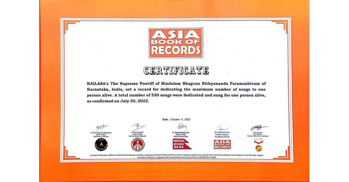 LOS ANGELES, CA, USA, October 29, 2022 /EINPresswire.com/ — KAILASA is happy and intensely honored to be conferred with the Asia Book of Records. The SPH Nithyananda Paramashivam has graced the pages of Asia Book of Records, in an thrilling feat of undertaking the extraordinary achievement of :