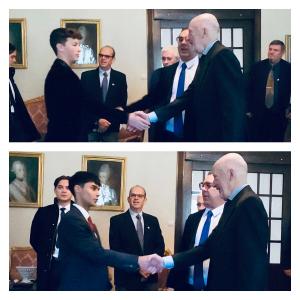 Joshua Strauss and Adrian E. Sanchez, the only two exceptional scholars selected to represent the State of Florida, USA in Bulgaria, interact with His Majesty King Simeon II of the Bulgarians (last king of Bulgaria and cousin of the late Queen of England, Elizabeth II)
