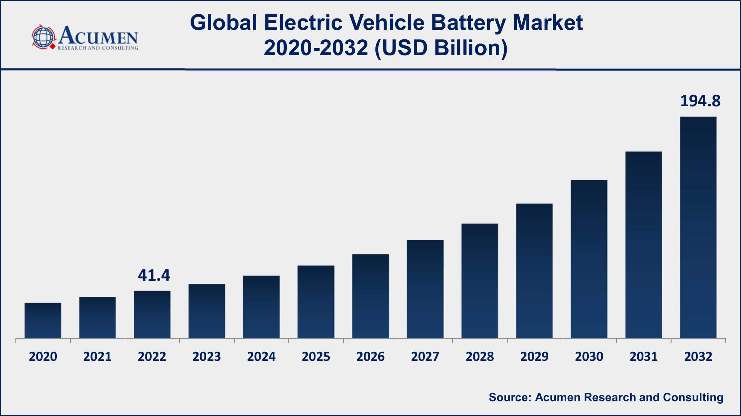 - In 2022, the worldwide Electric Vehicle Battery market was valued at USD 41.4 Billion, and it is projected to expand to USD 194.8 Billion by 2032. The market is estimated to experience a CAGR of 16.9% during this period.
