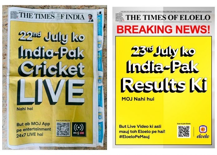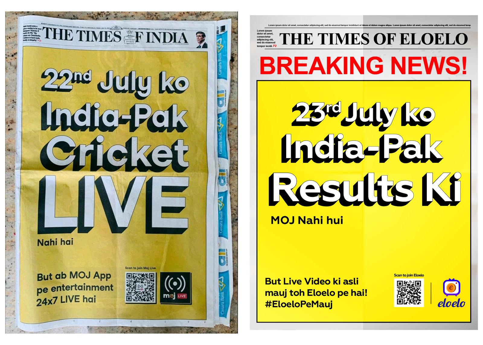Creatively mirroring the advertisement of Moj, which states that on 22nd July, India-Pak cricket is not live, but entertainment is always live on the Moj app, Eloelo replicates the concept by pointing out the clickbait nature of the ad while also stating that “Live Video ki asli mauj to Eloelo pe hai’ that translates to real fun to live video streaming is only available at Eloelo.