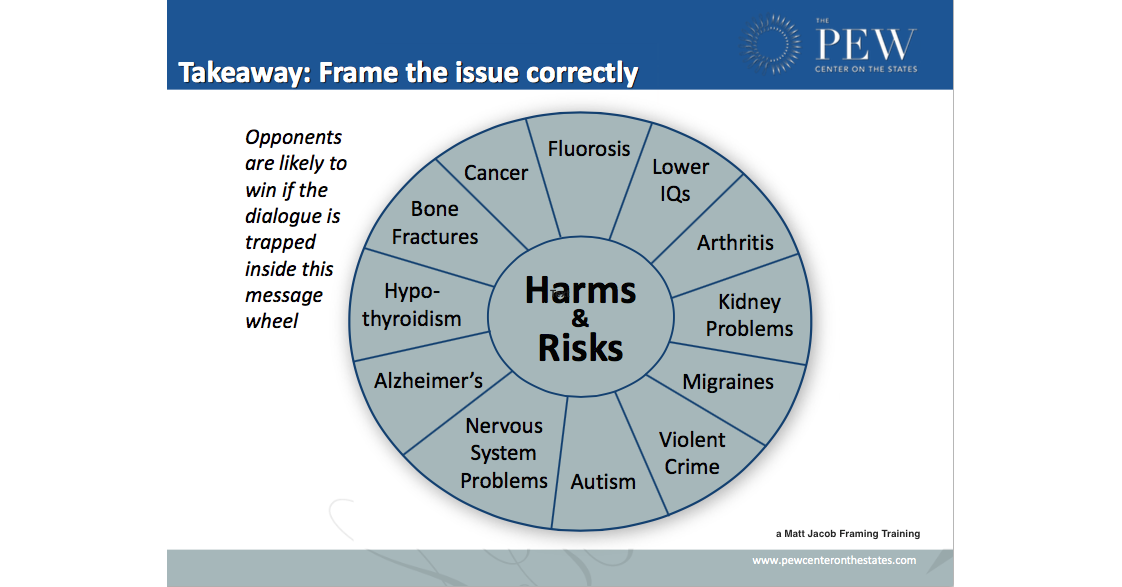 Spencer explains, “The fluoridationist marketing guru whose only degree is in journalism and who has made a living as a public relations consultant for pro-fluoridation factions since the 1990s created this “Harm Wheel” as part of a framing workshop. He coaches dentists and other fluoridationists to “frame” the conversation around cavity protection and to not allow any conversation about science that associates fluoridation with harms demonstrated in the wheel. Jacobs often travels to workshops with an internationally known fluoridationist who coaches dentists and members of the Board of Health to pound the table with their fist and loudly declare that they don’t have to debate science about fluoridation any more than they need to debate that the table is flat”. Spencer states, “The fact of the matter is there is substantial robust high-quality science documenting chronic ingestion of fluoride in water with all the harms in the Harm Wheel.”