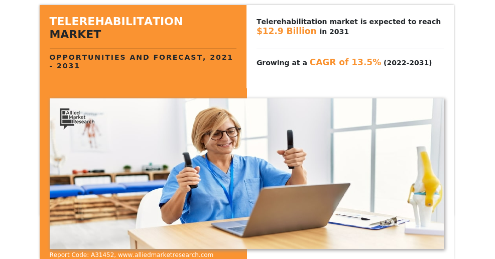 PORTLAND, OREGON, UNITED STATES, June 19, 2023/EINPresswire.com/ — The telerehabilitation market size was valued at $3.7 billion in 2021, and is estimated to reach $12.9 billion by 2031, growing at a CAGR of 13.5% from 2022 to 2031.