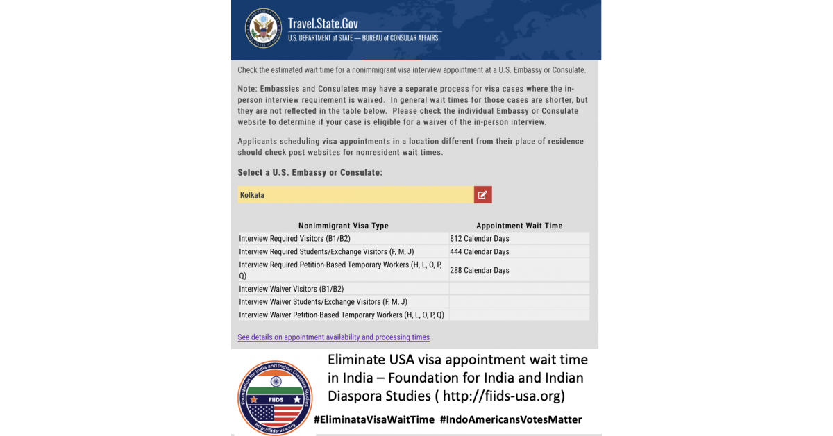 WASHINGTON, DC, USA, November 1, 2022 /EINPresswire.com/ — Foundation for India and Indian Diaspora Studies (https://FIIDS-USA.ORG) launched change.org petition urging the State Department, Secretary of State Mr. Anthony Bliken and the US embassies in India to eliminate wait occasions for visa appointments in India. Even after a two-year lengthy, Covid-era, pause in visa appointments at the US embassies in India, the visa appointment scenario is much from regular, requiring 300 to 900 days of wait time primarily based on the visa sorts. As per journey.state.gov studies on 10/31/2022, there may be a median 900+ days wait time for appointments for guests’ visa(B1/B2), a median 400 days wait time for college students (F, M,J) and a median 300 days wait time for petition-based temp employees like H, L, O, P and Q throughout the USA consulates in India (Mumbai, New Delhi, Hyderabad, Chennai and Kolkata) . In distinction, the US consulates in China solely have a median 3 days wait time.