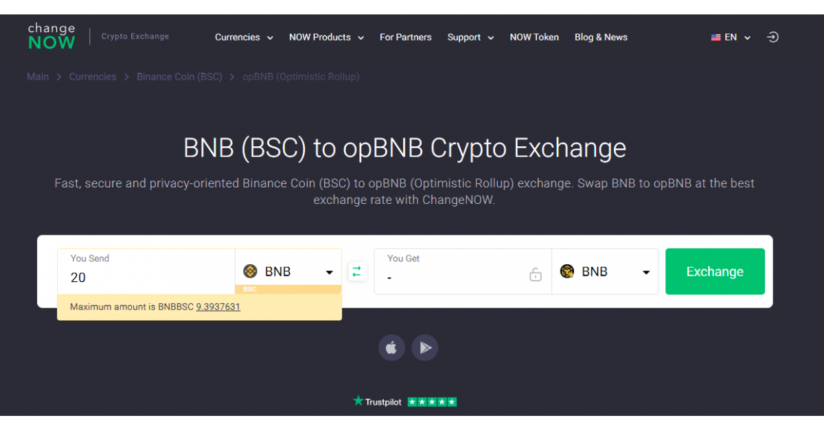 You can bridge to opBNB now, with ChangeNOW’s convenient user interface and exceptional functionality. Users are able to effortlessly exchange opBNB to/from 900 other assets.