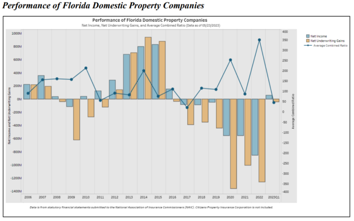 Net income for Florida insurers, not including Citizens, rose to about $60 million for Q1 2023, a far cry from the industry’s net losses reported for all of 2022. That may be due in part to investment gains, but the combined ratio als dropped to less than zero for the first time since 2017. Underwriting losses shrank to about $50 million, compared to almost $340 million in losses for all of 2022.