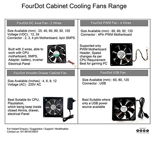 Build with 4pin Motherboard connector including mounting screw. The inventory/testing before packing of the product is managed by FourDot. This commercial grade silent cooling fan operated by 12V and takes 0.18Ampere current, the fan speed vary from 2000 to 2500rpm.
