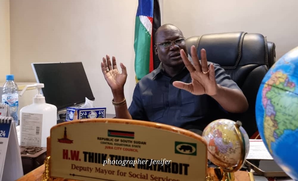 The Deputy Mayor for Social Service, Thiik Thiik Mayardit, addresses journalists on Wednesday. [Jenifer James, The City Review]