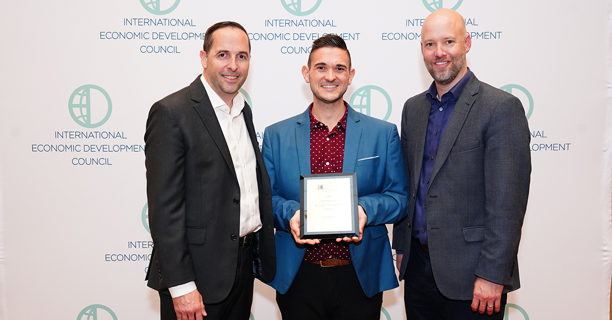 IEDC leadership present the Gold Award to the Grand Forks Region EDC at the annual conference in Dallas, TX. From left to right, IEDC President & CEO, Nathan Ohle, Grand Forks Region EDC Marketing & Communications Manager, Mark Maliskey, and IEDC Chair, J