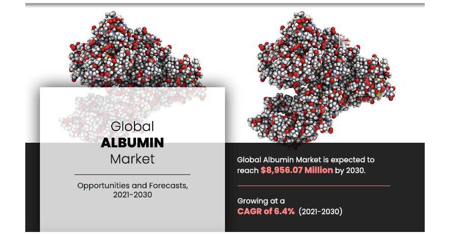 PORTLAND, OREGON, UNITED STATES, April 12, 2023 /EINPresswire.com/ — Allied Market Research has published a study report with the title Albumin Market Size was Valued at 𝐔𝐒𝐃 𝟒.𝟖𝟏 𝐁𝐢𝐥𝐥𝐢𝐨𝐧 𝐢𝐧 𝟐𝟎𝟐𝟎, and is Projected to Garner 𝐔𝐒𝐃 𝟖.𝟗𝟓 𝐛𝐢𝐥𝐥𝐢𝐨𝐧 𝐛𝐲 𝟐𝟎𝟑𝟎, registering a 𝐂𝐀𝐆𝐑 𝐨𝐟 𝟔.𝟒% from 2021 to 2030.